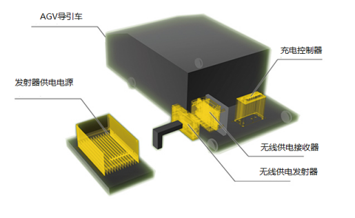 如下图所示,在工厂中设定一个无线充电充电平台(包括发射器供电电源和无线供电发射器),在AGV小车中内置无线供电接收器和充电控制器。